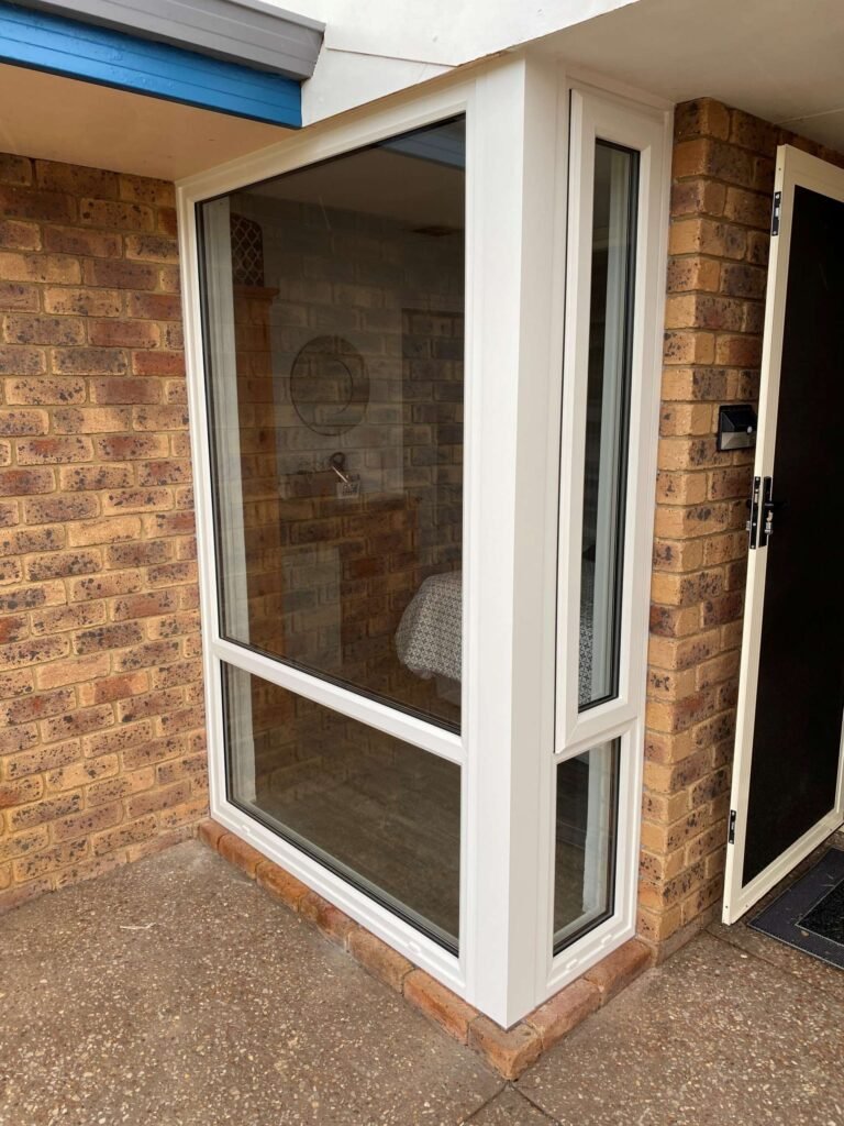 These stunning White uPVC framed windows have been installed locally. They consist of awning style windows which have been installed as a corner bay. This gives a beautiful fresh finished look which the customer is very pleased with and now would like to upgrade his front and back door also to UPVC frame.